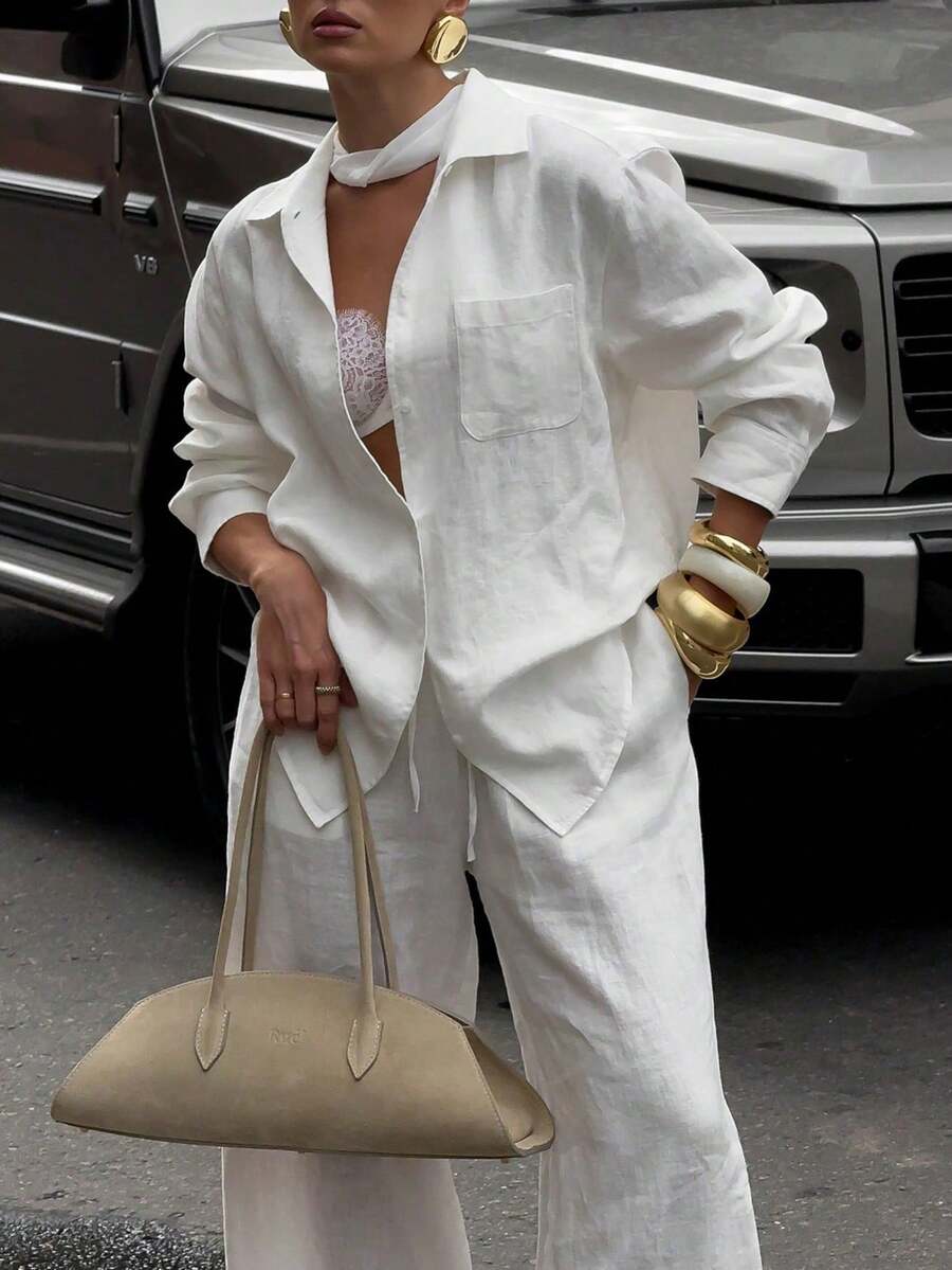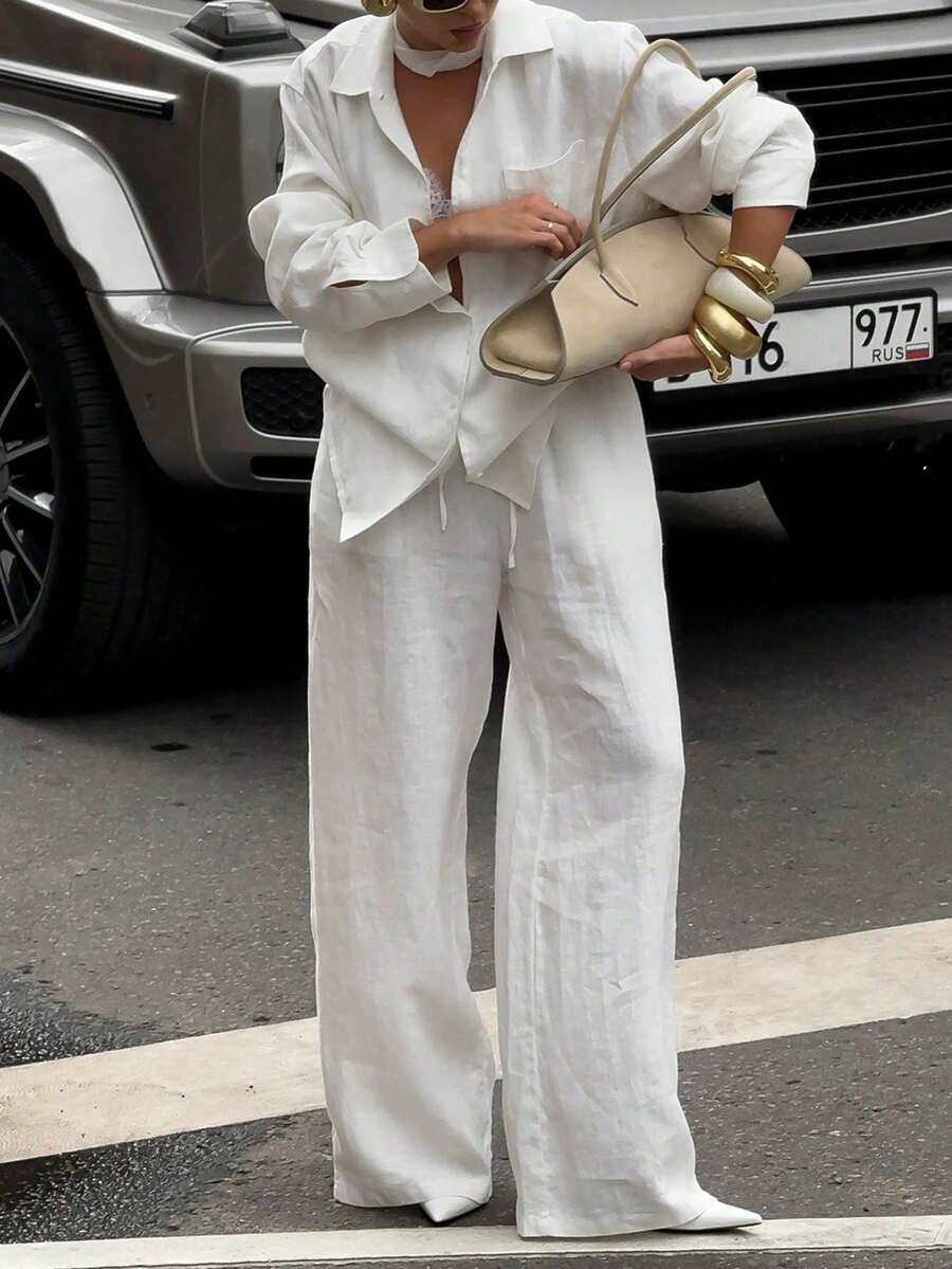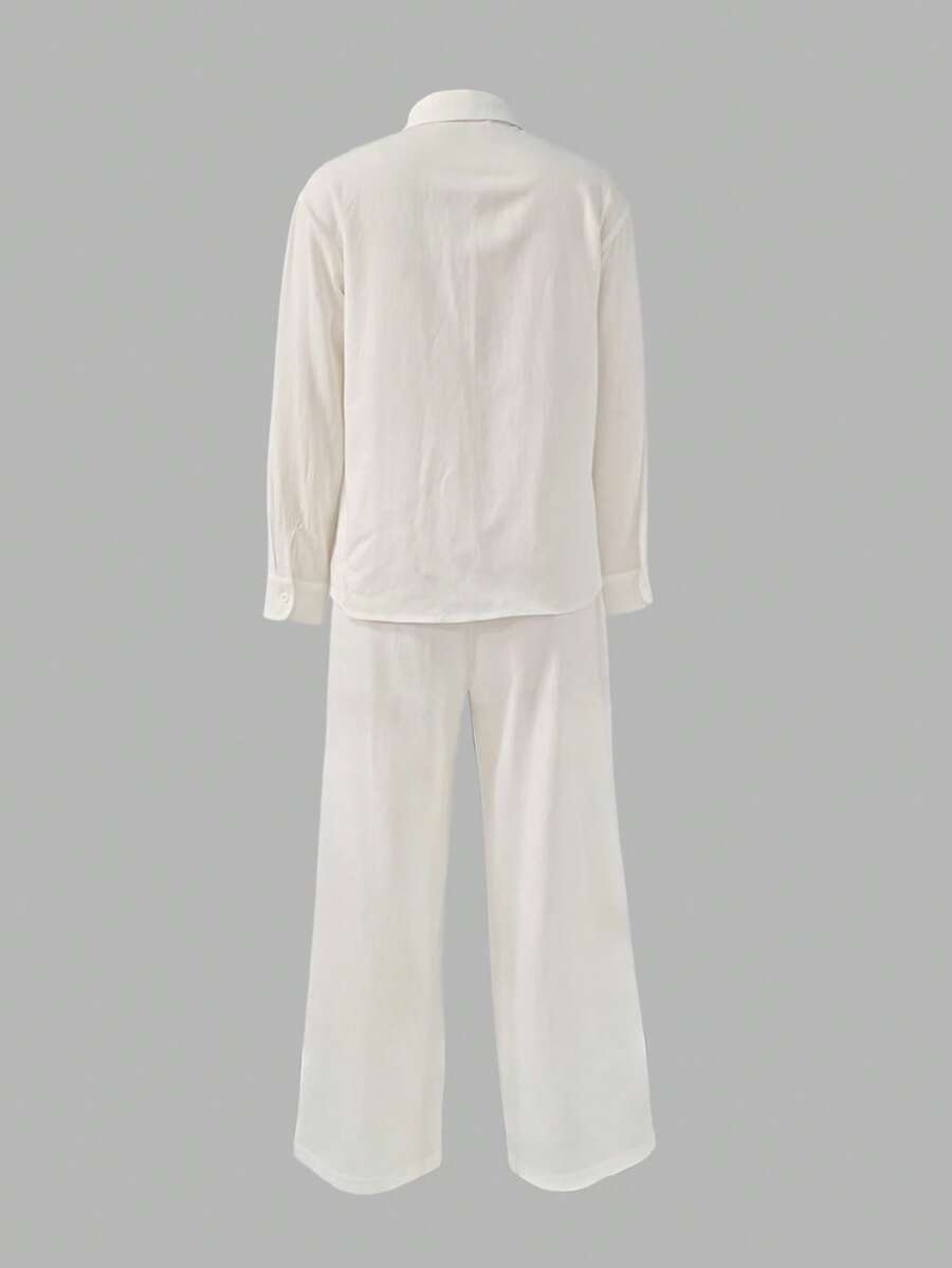 2 Peças Conjunto de Camisa e Calça Elegante e Casual de Cor Sólida com Bolso e Botão, Uso Escritório e Casual, Primavera/Outono. Disponível nas cores: verde, preto, creme e bege.