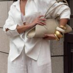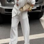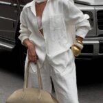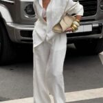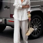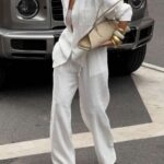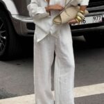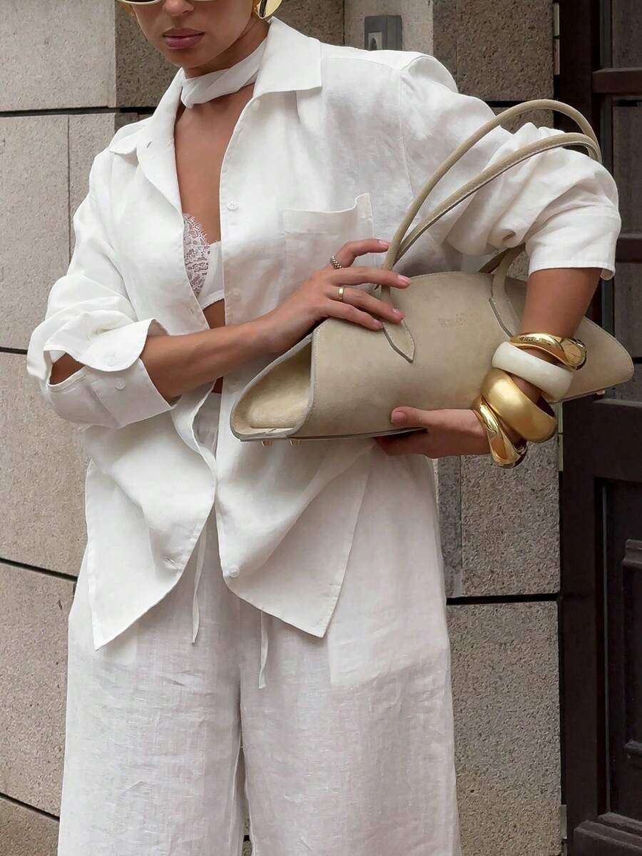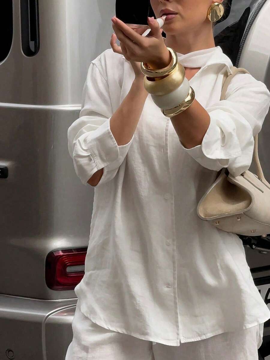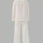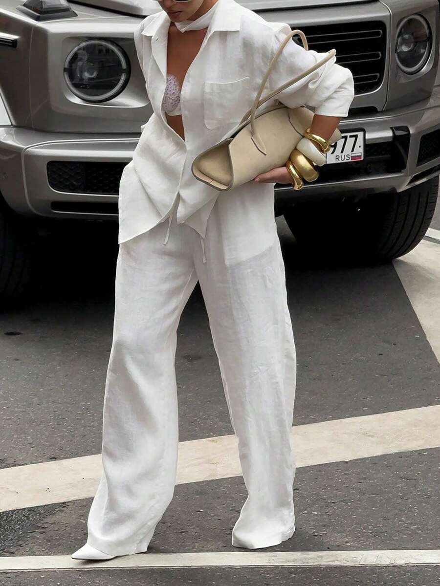 2 Peças Conjunto de Camisa e Calça Elegante e Casual de Cor Sólida com Bolso e Botão, Uso Escritório e Casual, Primavera/Outono. Disponível nas cores: verde, preto, creme e bege.