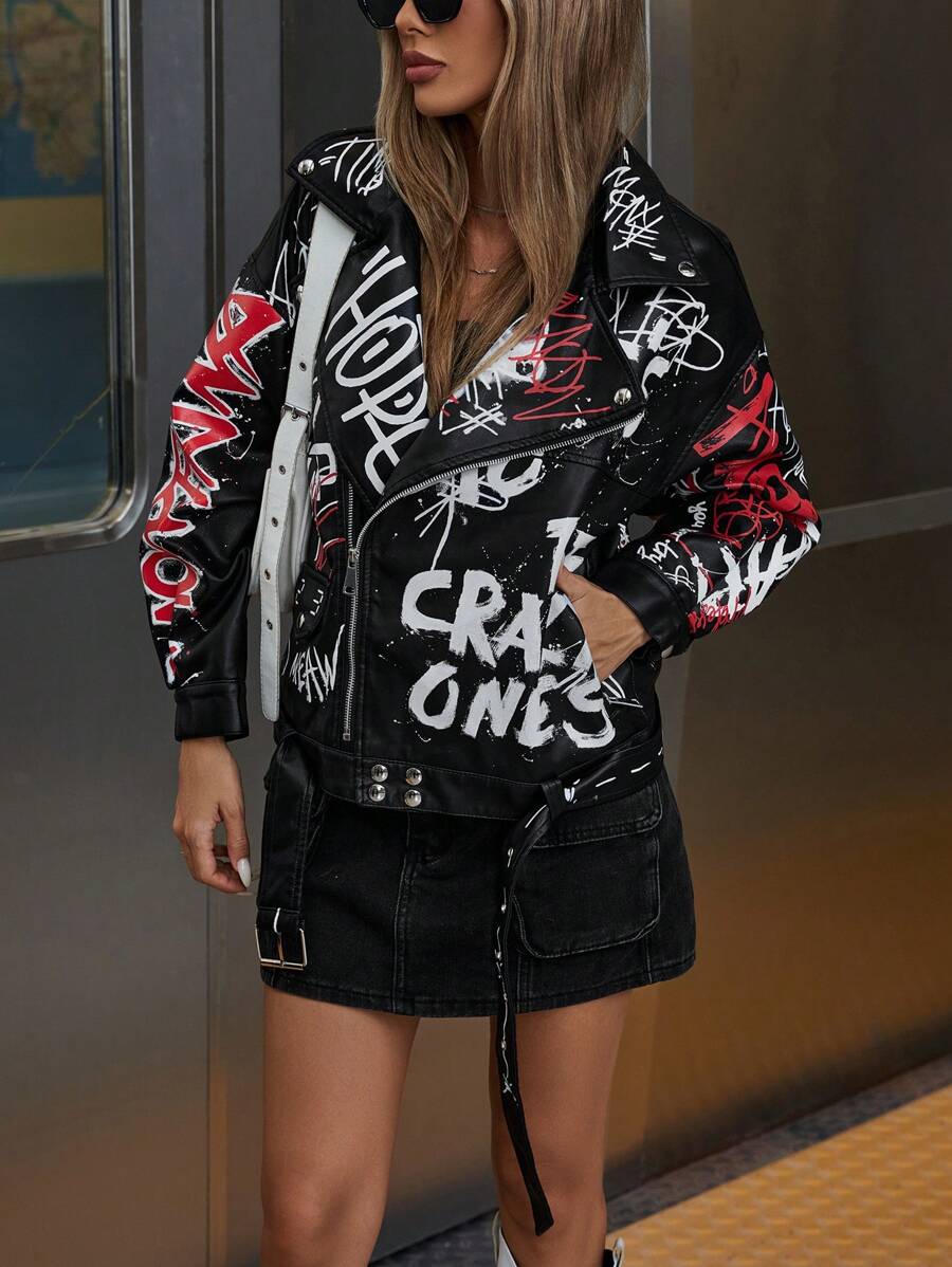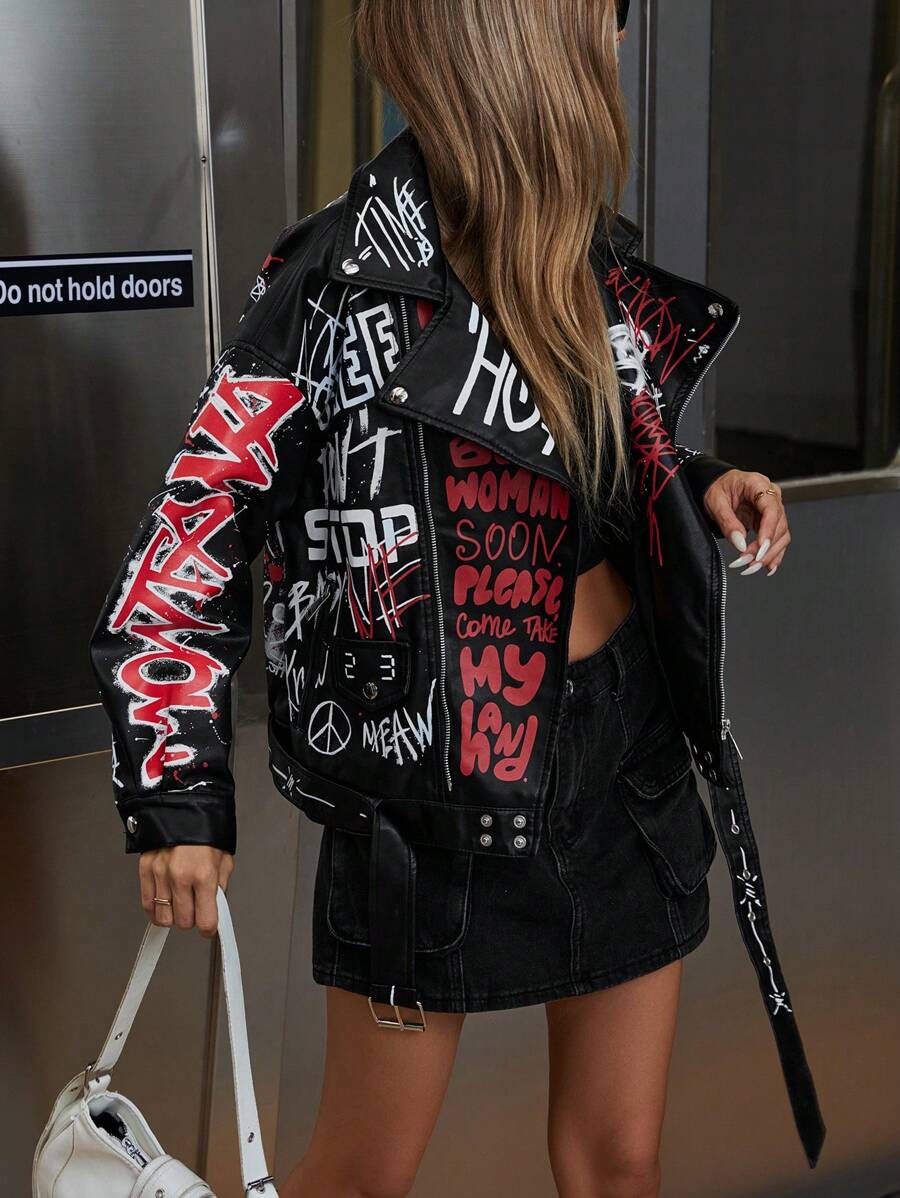 Aveloria Affinna – Jaqueta de Couro Estilo Gótico Punk com Letra Grafite Colorida na Moda