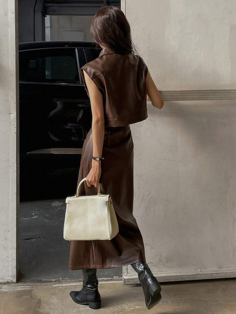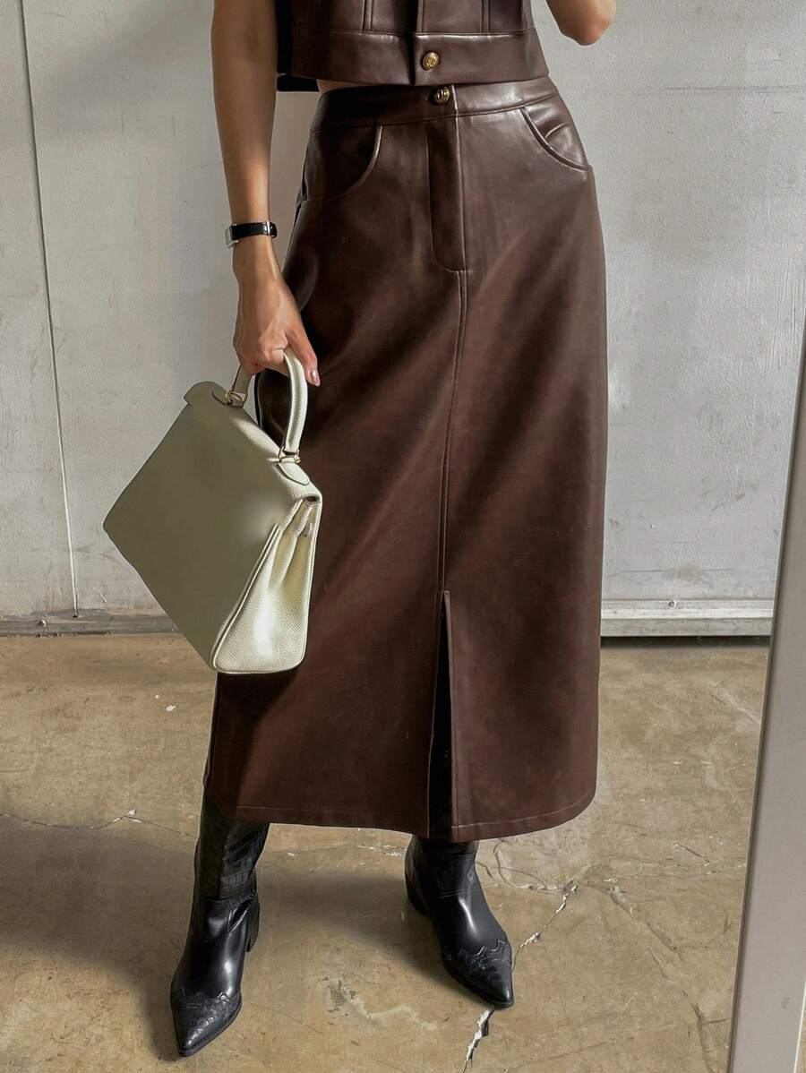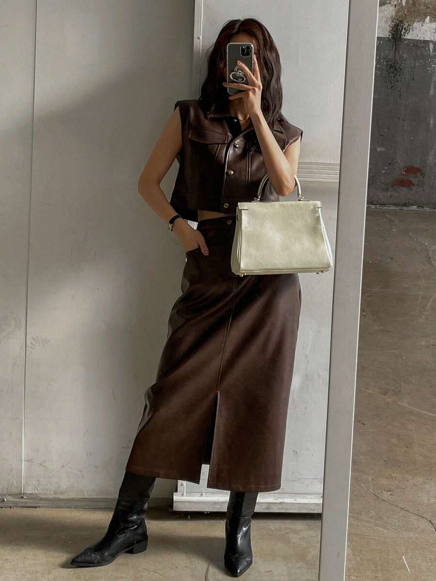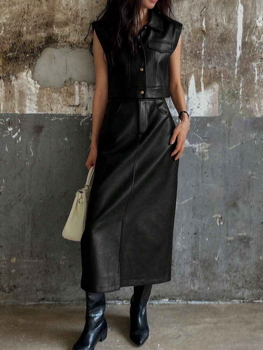 DAZY Conjunto de 2 peças Jaqueta Sem Mangas com Detalhe de Aba em Couro PU e Saia Reta com Barra Dividida, Outono/Inverno para Mulheres (disponível em variadas cores).