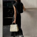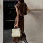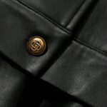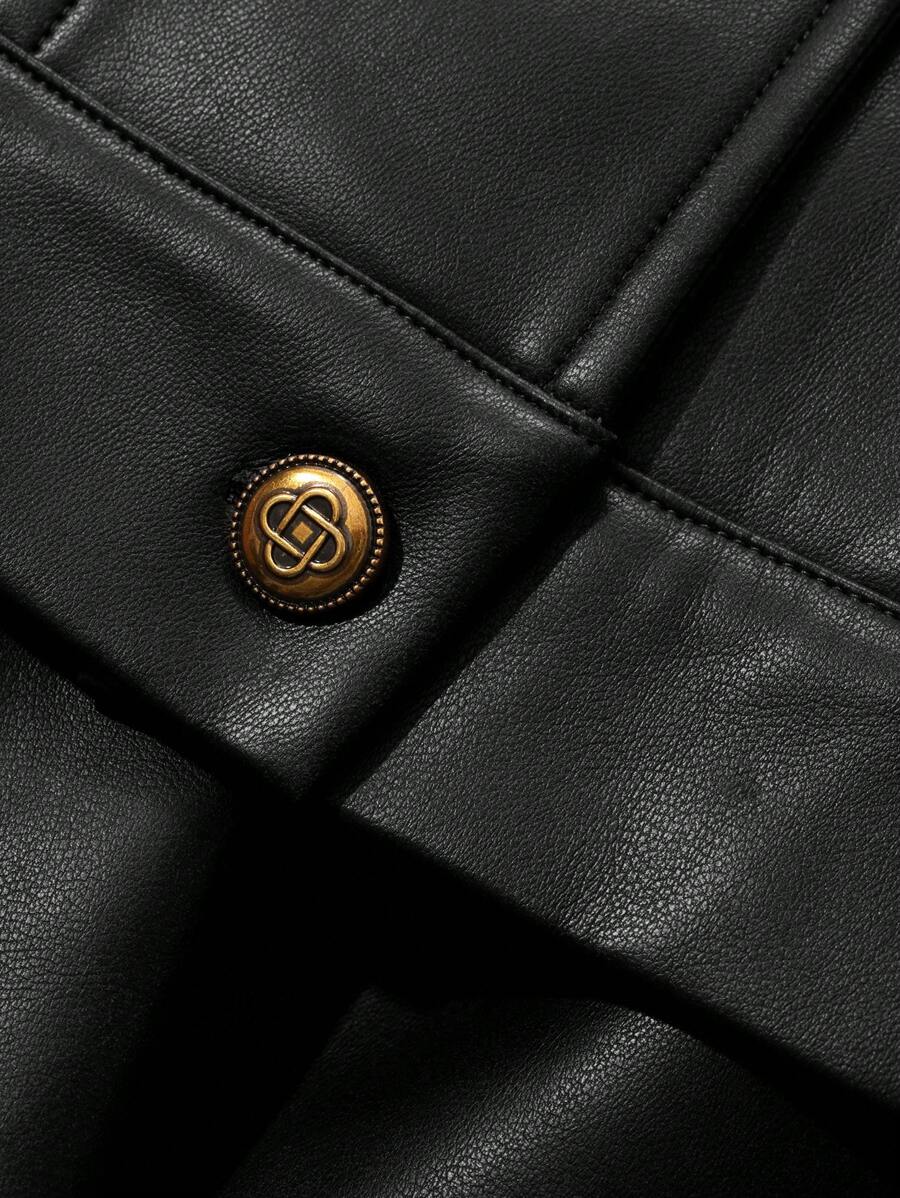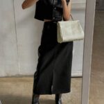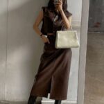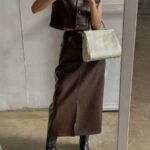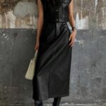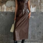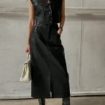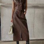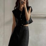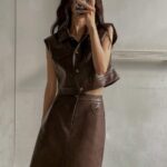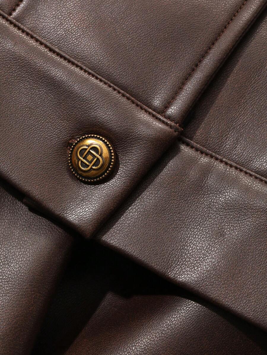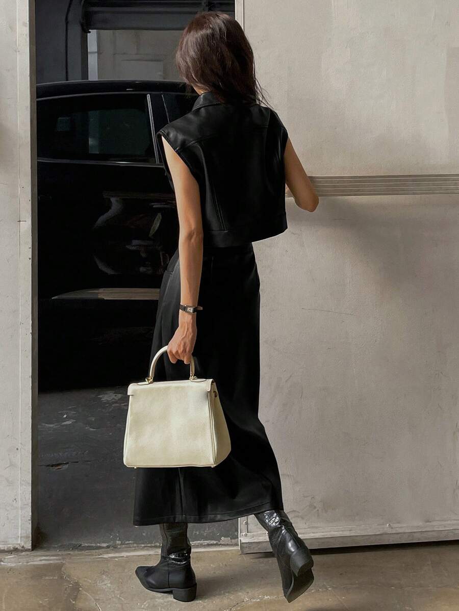 DAZY Conjunto de 2 peças Jaqueta Sem Mangas com Detalhe de Aba em Couro PU e Saia Reta com Barra Dividida, Outono/Inverno para Mulheres (disponível em variadas cores).